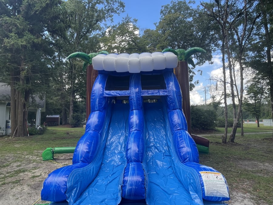 -Features- Jumping Area Double Basketball Hoop Double Slide Area Two Participants At A Time Pool Area ALWAYS Cleaned & Sanitized At Setup Properly Staked Safety Netting -Requirements- Flat Surface For Setting Up Clear Of Power Lines Above And Below Can Not Be Setup Touching Trees Or Other Objects Water Hose Ran To Back Of Slide Must Be Within 50ft Of Power Source